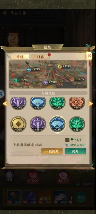 提升门客的赚钱速度,商会面板中的店铺收益也会随之提升,因此调整议事厅位置至关重要。后期主要依靠移动议事厅来提高整体收益排名。