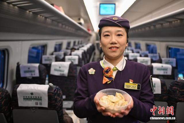2月16日,农历除夕,由中国铁路沈阳局集团有限公司大连客运段动车四队担当的沈阳-锦州北D7764次列车上,D7764次列车长商烨为旅客送上热腾腾的饺子,让旅客在高铁上感受着浓浓的年味儿,共庆春节到来。图为列车长商烨展示饺子。中新社记者 于海洋 摄