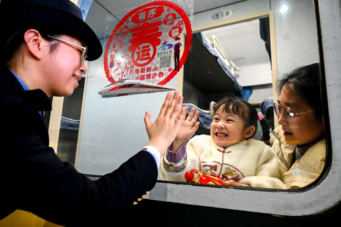 2月15日,江西南昌,列车出发前,旅客与南昌站工作人员挥手道别。