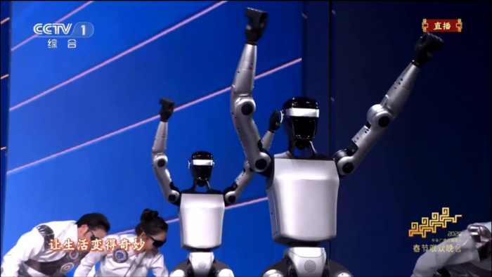 《武BOT》中,宇树科技再次大秀肌肉,G1机器人与真人演员齐登台,用上长剑、双节棍、长棍展示多重“武功”。