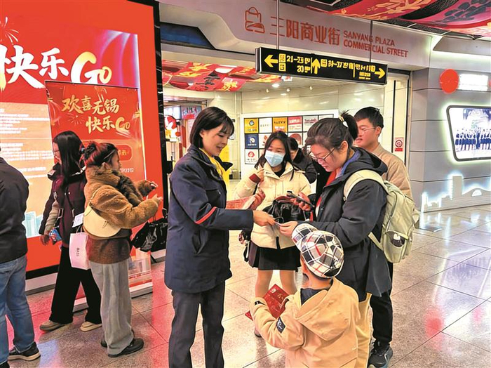 “市民游客领券很积极,仅三阳广场站1个多小时就发掉300多张。”无锡地铁资源开发有限公司相关负责人介绍,消费券覆盖酒店餐饮、购物商超等核心消费场景,同时延伸至地铁、机场两大交通出行领域,全方位满足市民游客春节期间的多元化消费需求。其中,地铁商业优惠精准聚焦沿线商业场景,串联起三阳广场站等核心商圈的缤纷好礼,为市民出行消费增添更多便利和实惠,让无锡市民和外地游客在便捷出行中度过一个年味十足、福利满满的春节假期。