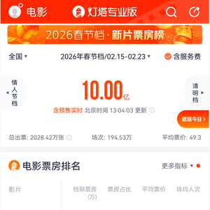 2月17日午后,灯塔专业版数据显示,2026年春节档票房(含预售)已突破10亿元。