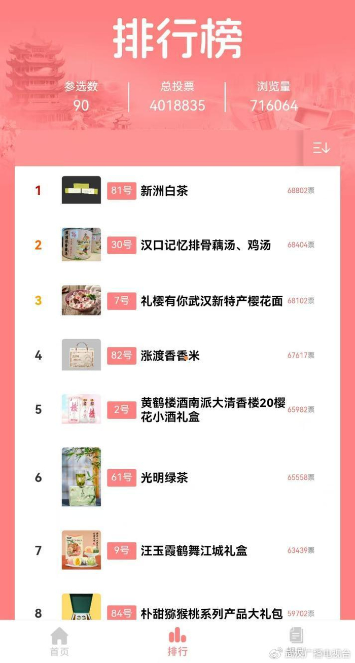 武汉特色伴手礼的角逐也是如火如荼,总榜实时更新,本土优质好物同台竞技、亮点纷呈。