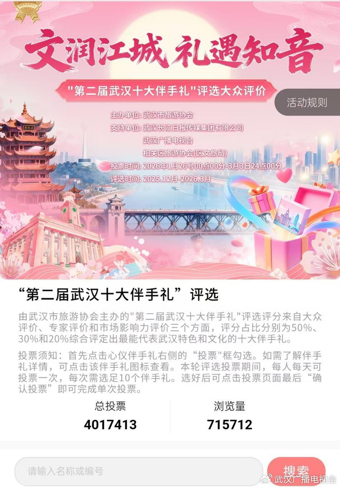 第二届武汉“十大名菜”“十大名点”“十大伴手礼”自2026年1月26日市民投票通道正式全面开启以来,广大市民朋友积极响应、踊跃参与,主动为心仪的本土美食与好物点赞投票,用每一张选票传递对武汉本土美食与文化的热爱与支持。