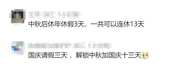一些网友表示,“我挺喜欢的,多一天不用调休,上六天班受不了”;也有网友表示“调休不调休,全年法定节假日天数是固定的”。还有网友想到“中秋后年假休3天,一共可以连休13天。”