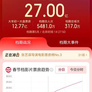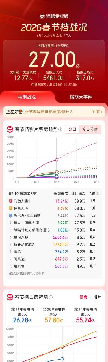 2026春节档总票房破27亿 界面新闻 界面新闻官方账号 02.1914:32 关注 据猫眼专业版数据,2026年春节档档期总票房(含预售)破27亿,《飞驰人生3》《惊蛰无声》《熊出没·年年有熊》分列前三位。