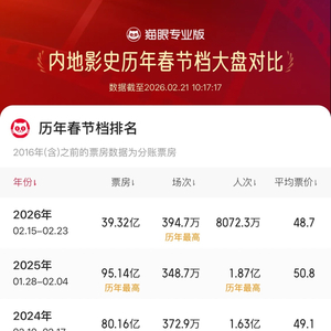 猫眼专业版数据显示,2026年春节档总场次超394.7万,刷新中国影史春节档总场次纪录,截至当前2026春节档总票房已达39.32亿。