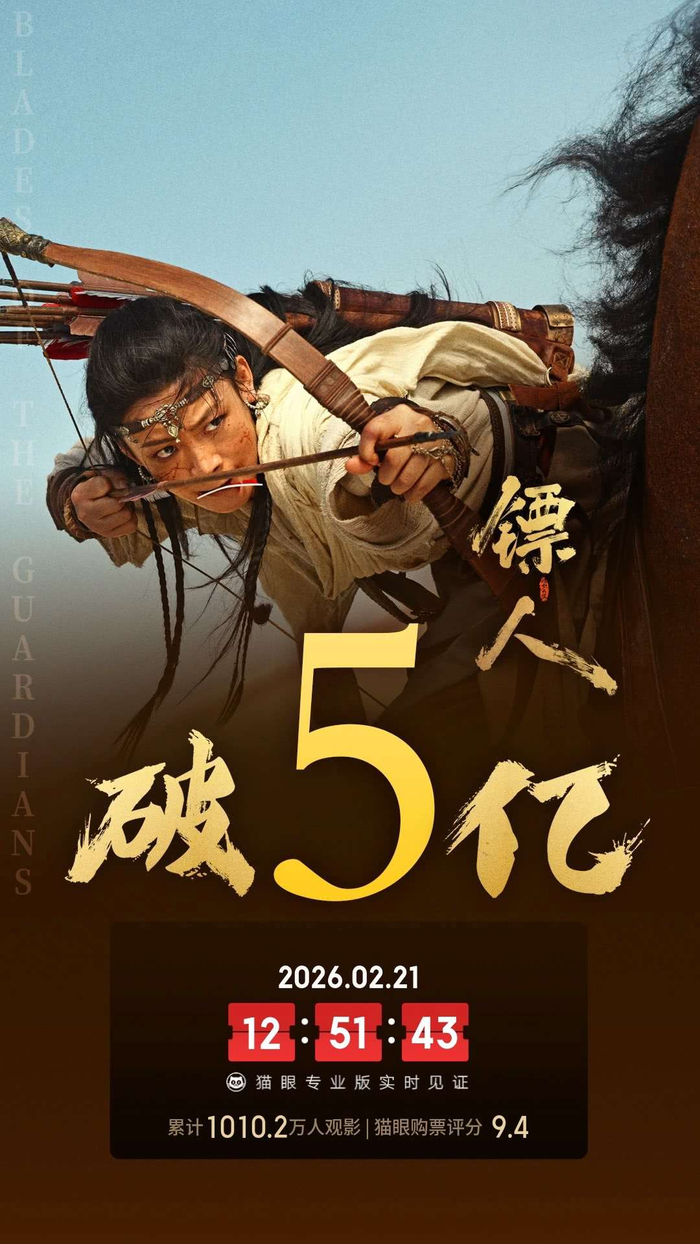 据猫眼专业版数据,截至2月21日12:51,电影《镖人:风起大漠》 总票房破5亿,为2026年春节档第四家总票房破5亿的电影。此前《飞驰人生3》、《惊蛰无声》和《熊出没·年年有熊》分别突破20亿、6亿和5亿。
