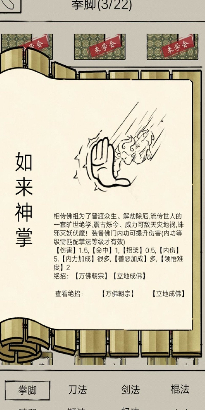在老乞丐处蹲点,与其对话获取如来残页1-10,即可习得如来神掌,少林、逍遥门派可修炼。