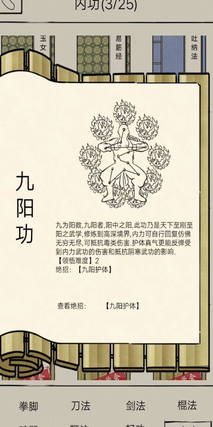 每回合恢复内力,等级提升后内力上限与回复量均增加。