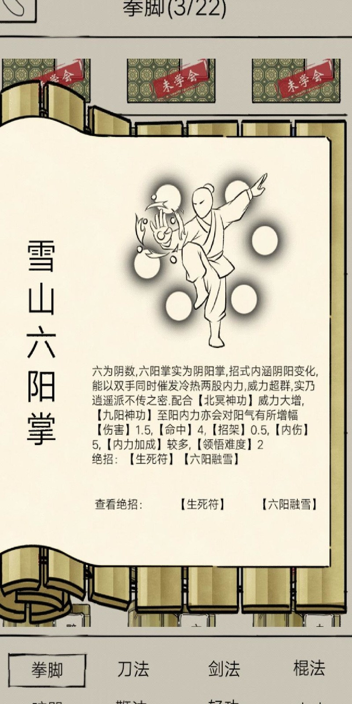 雪山六阳掌需在雪山派习得,遇七次机缘,第六次获武学,第七次得绝招。
