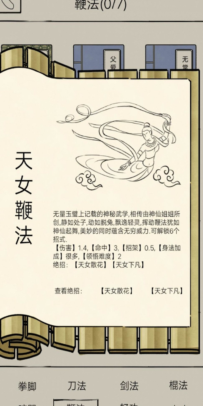 玉女门派天女鞭法,女性角色专属,需相遇七次,第六次习得武功,第七次获绝招。