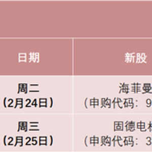 日程安排上,周二(2月24日)可申购北交所新股海菲曼,周三(2月25日)可申购创业板新股固德电材。