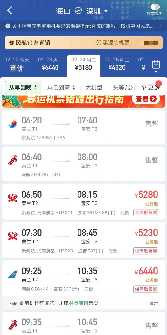 海口方面,出港机票同样紧俏。2月22日,海口至深圳直飞航线全部售罄。