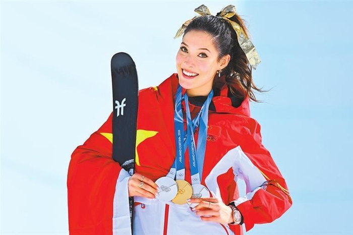 谷爱凌在颁奖仪式后展示自己在本届冬奥会上获得的三枚奖牌。