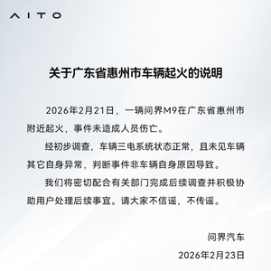 每经AI快讯,据问界用户服务公众号2月23日消息,问界汽车发布关于广东省惠州市车辆起火的说明:经初步调查,车辆三电系统状态正常,且未见车辆其它自身异常,判断事件非车辆自身原因导致。