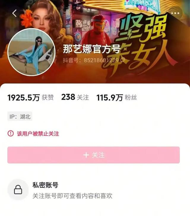 被湖北省文旅厅认定为劣迹艺人后,近日,那艺娜的抖音平台多个账号被禁止关注,视频被清空,搜索栏也无法找到其账号。