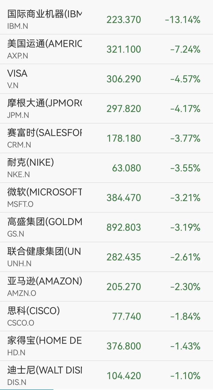 道指成份股中,IBM跌13%,美国运通跌逾7%,领跌道指。