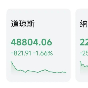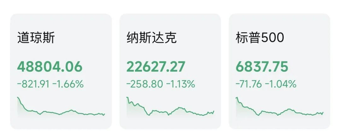 截至收盘,道指跌1.66%,报48804.06点,跌821.91点;标普500指数跌1.04%,报6837.75点;纳指跌1.13%,报22627.27点。