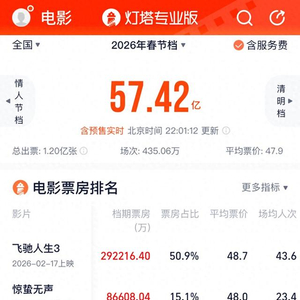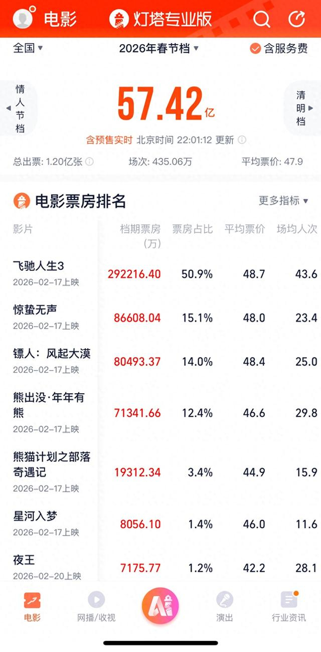 据灯塔专业版数据显示,截至2月23日22时,春节档总票房57.42亿元,《飞驰人生3》(29.2亿)、《惊蛰无声》(8.66亿)《镖人:风起大漠》(8.04亿)分列前三,三部影片累计票房达占档期总票房的80%以上。