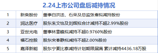2月24日增减持汇总:华能水电等5股增持 新柴股份等5股减持(表)