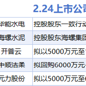 据统计,2月24日,盘后华能水电、海螺水泥、开普云、中顺洁柔、元力股份披露增持情况。包括新柴股份、润达医疗、亚世光电、福石控股、嘉泽新能在内的5家A股上市公司披露减持情况。