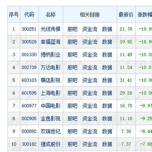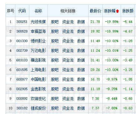 2月24日早盘,A股电影板块出现集体下跌。截至收盘,光线传媒(SZ300251)、博纳影业(SZ001330)、中国电影(SH600977)、万达电影(SZ002739)、上海电影(SH601595)、横店影视(SH603103)等多只个股跌停,幸福蓝海(SZ300528)、金逸影视(SZ002905)逼近跌停。