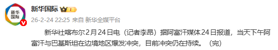 新华社喀布尔2月24日电(记者李昂)据阿富汗媒体24日报道,当天下午阿富汗与巴基斯坦在边境地区爆发冲突,目前冲突仍在持续。