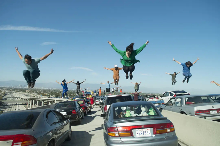 人们堵在拥挤的车流里,但音乐一响,不同族裔,不同年龄,不同身份的人,都纷纷从车里跳出来唱歌跳舞。