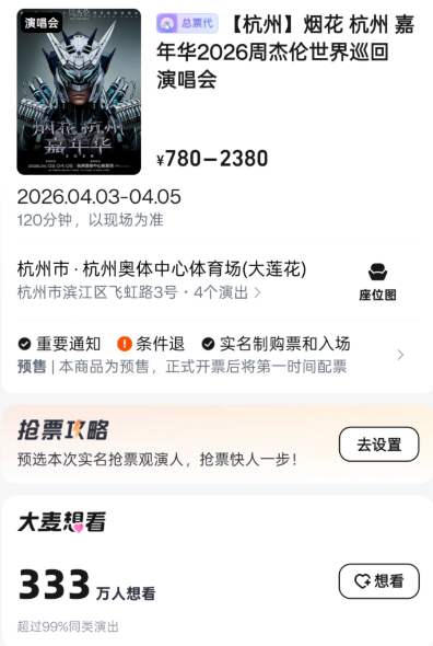 开票前几分钟,平台上已经有近333万人想看本场演出,而且数字还在不停飙升。社交媒体上一搜,都是在问“买哪个价位的观感最好”,以及“杰伦演唱会必须看第一场”。