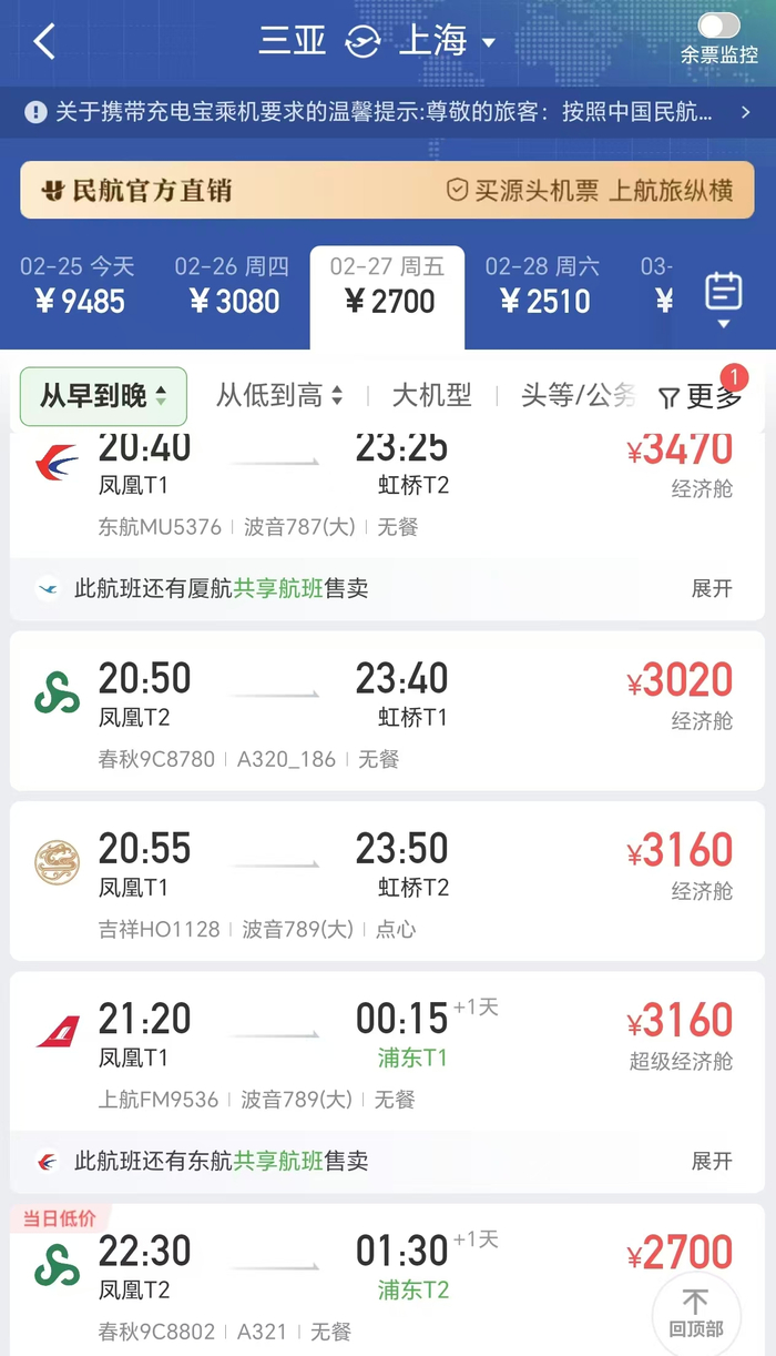 今年春节,国内旅游市场活跃,返程高峰期国内机票曾直逼万元大关。界面记者查询多家平台发现,2月22日至23日期间,从三亚飞往北京、上海等核心城市的直飞航班经济舱几乎全部售罄,仅剩的公务舱票价普遍超过八千,最高达9990元。