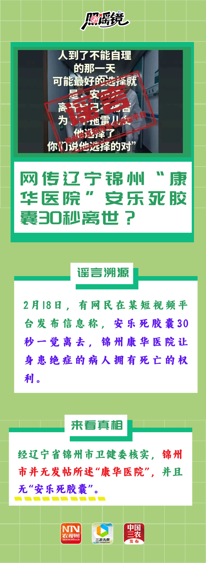 辽宁锦州“康华医院”安乐死胶囊30秒离世?三大运营商合并为中国通信,喊你来领钱?正月剃头死舅舅?这不能信!| 照谣镜