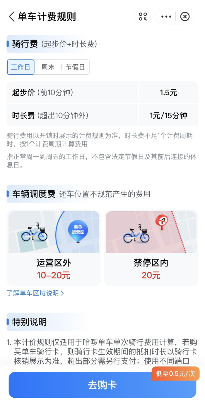 美团单车的起步价为15分钟1.5元,单价比哈啰更便宜。