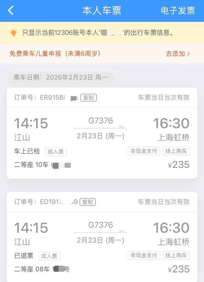 24日下午,记者联系到上述网友。从其提供的订单截图来看,这两张车票均为2月23日14时15分开出的G7376次列车,且均是线上购买。其中一张车票的状态显示为“已退票”。该网友告诉记者,自己是在开车前一分钟退掉了其中一张票,但被扣除了20%的手续费,“如果是在开车后才发现的,那这张票可能就退不掉了。”