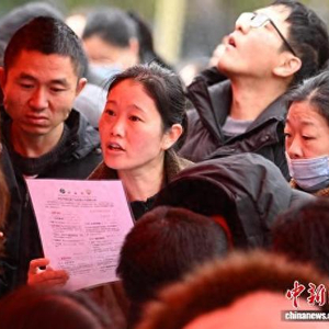2月25日,江苏南京,应聘者在招聘摊位前查看招聘信息。中新社记者 泱波 摄