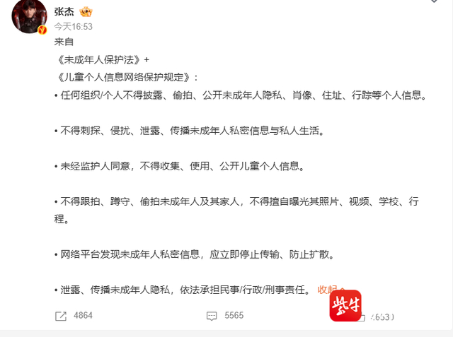 2月25日,“谢娜带双胞胎女儿上课”登上微博热搜,一个八卦自媒体博主上午发布了相关视频,视频中拍摄了两个孩子的正面。作为母亲的谢娜对此行为表示了强烈的不满,在社交平台紧急发声,恳切呼吁外界不要再将镜头对准未成年孩子,全文以密集感叹号分隔字句,累计使用68个感叹号,情绪强烈。随后,张杰也发文表达态度,引用了《未成年人保护法》和《儿童个人信息网络保护规定》,对偷拍行为表示谴责。