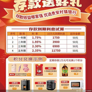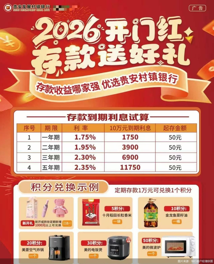 为核实相关情况,北京商报记者以储户身份进行了咨询,贵安新区发展村镇银行一位客户经理发来该行2026年“开门红”存款送好礼活动详情。从利率表现来看,该行定期存款利率起存金额为50元,一年期、二年期、三年期、五年期存款利率分别为1.75%、1.95%、2.3%、2.35%,以存入10万元存款为例,到期利息分别为1750元、3900元、6900元、11750元。除了利息收益,活动还设置了积分兑换福利,定期存款1万元可兑换1个积分,5积分可兑换大米一袋,10积分可兑换菜籽油一桶。