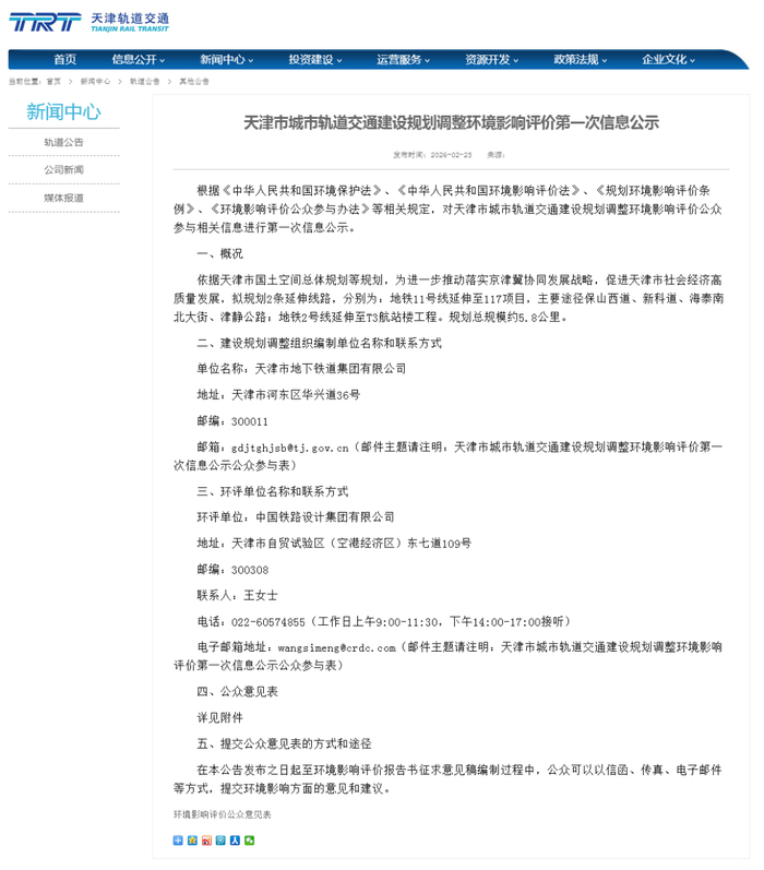 2月25日,天津轨道交通集团发布《天津市城市轨道交通建设规划调整环境影响评价第一次信息公示》,公示内容显示,天津拟规划2条延伸线路,规划总规模约5.8公里。