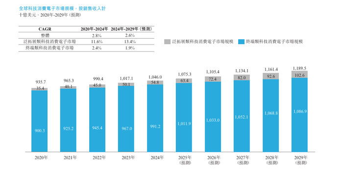 当前,消费电子配件市场正同时处于规模扩容与格局重塑的阶段。弗若斯特沙利文报告显示,2024年,全球科技消费电子市场规模达到10460亿美元,预计到2029年将增长至11895亿美元,2024年至2029年的年复合增长率约为2.6%。