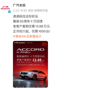 广汽本田近日宣布,为庆祝雅阁50周年,老客户复购雅阁e:PHEV车型,仅需13.88万元,较官方指导价直降10万元,创下上市后最高降价纪录,限量1000辆。
