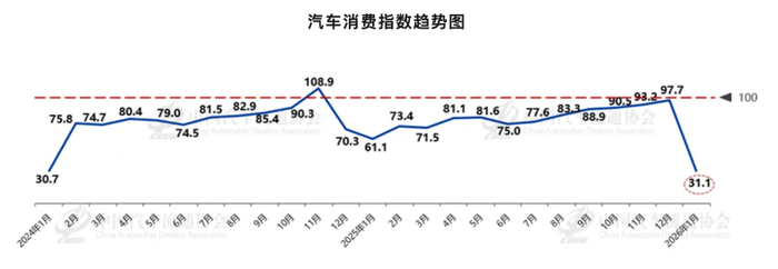 中国汽车流通协会数据显示,今年1月的汽车消费指数仅为31.1,处于历史低位。