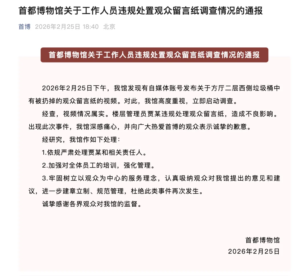 首都博物馆2月25日发布关于工作人员违规处置观众留言纸调查情况的通报。