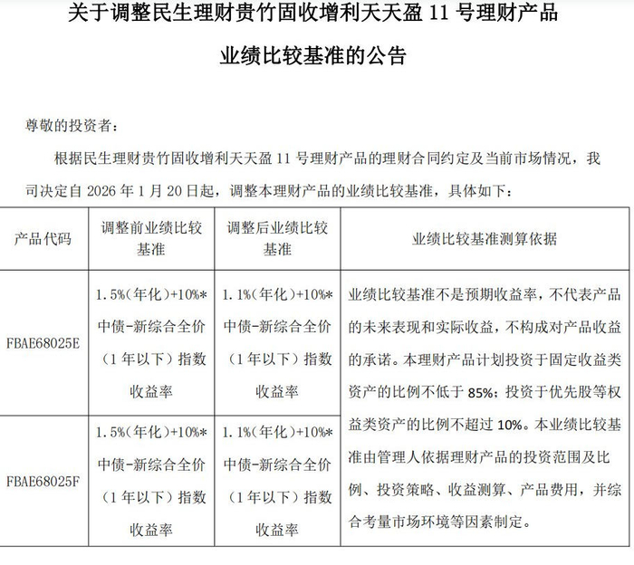 不过即使为指数型业绩比较基准,在市场情况、投资策略等发生变化时,理财公司也会调整业绩比较基准,比如民生理财1月份调整了“贵竹固收增利天天盈11号理财产品”的指数型业绩比较基准,下调了固定数值部分。