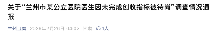 “兰州市某公立医院医生因未完成创收指标被待岗”?官方通报