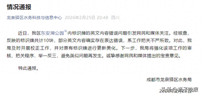 近日,我区东安湖公园内标识牌的英文内容错误问题引发网民和媒体关注。经核查,反映的标识牌共计10块,部分英文内容确实存在表达错误,系工作把关不严所致。对此,我局及时开展校正工作,并对原有标识牌进行更新美化。下一步,我局将强化该项工作的审核、把关程序,举一反三,避免类似问题再发生。诚挚感谢网民和媒体提出的宝贵意见。