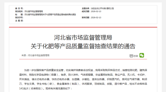 近日,河北省市场监督管理局网站发布化肥等产品质量监督抽查结果。