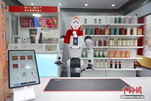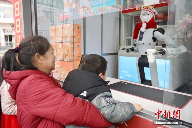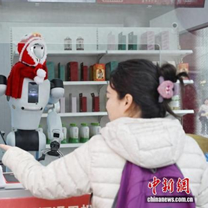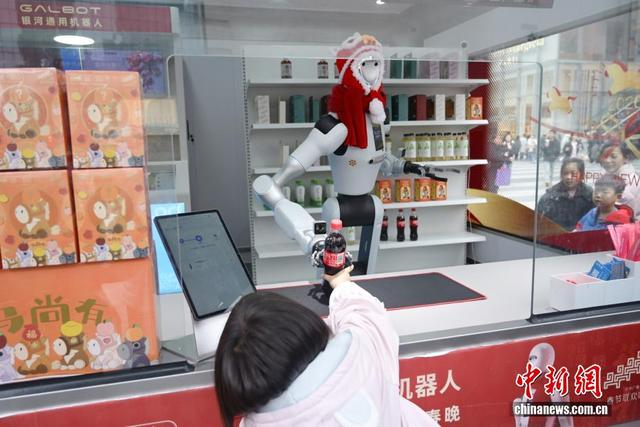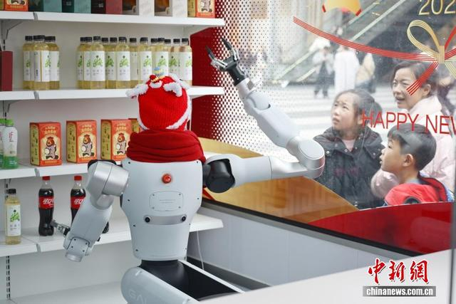 中新社记者 杨华峰 摄 2月25日,湖南各地迎来春节后复工复产,长沙街头的智能机器人售货员节后上岗。它不仅能熟练售卖饮料、零食,还能和路人趣味互动、智能应答,科技感十足。图为机器人售货员为顾客拿饮料。
