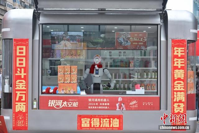中新社记者 杨华峰 摄 2月25日,湖南各地迎来春节后复工复产,长沙街头的智能机器人售货员节后上岗。它不仅能熟练售卖饮料、零食,还能和路人趣味互动、智能应答,科技感十足。图为机器人售货员等待顾客光临。