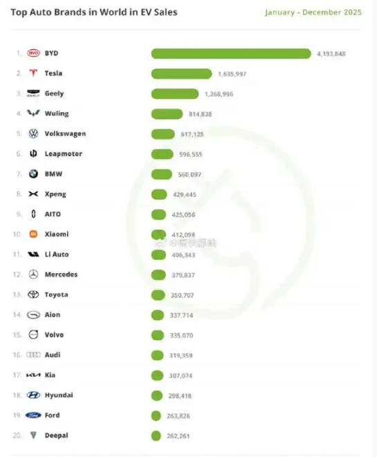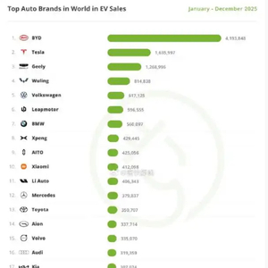 2月25日消息,Clean Technica公布了2025年全球新能源汽车销量TOP20榜单。比亚迪以419.38万辆的销量稳居榜首,特斯拉以163.6万辆位居第二,小米以41.2万辆首次进入全球前十。