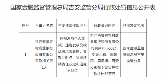 2月26日金融一线消息,据国家金融监督管理总局吉安监管分局行政处罚信息公开表显示,江西安福农村商业银行股份有限公司因违规发放个人贷款、违规发放贷款延缓风险暴露、贷款冲时点、呆账核销责任认定和追究不到位,被罚款180万元。同时,相关责任人姚小梅、周朝阳、周星桥、周荣被分别给予警告并罚款共计32万元。
